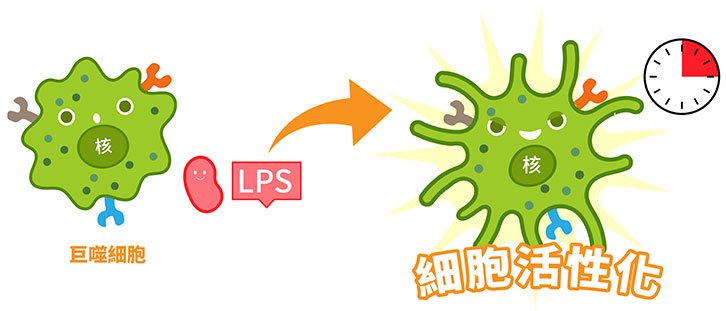 LPS脂多醣會經口腔進入腸道,並活化腸道的巨噬細胞,令其進入並保持「等待作戰」狀態。當遇到外來病菌、病毒入侵身體,巨噬細胞就會迅速轉為「戰鬥巨噬細胞」狀態,清除外來物,維持著整個免疫系統的健康。