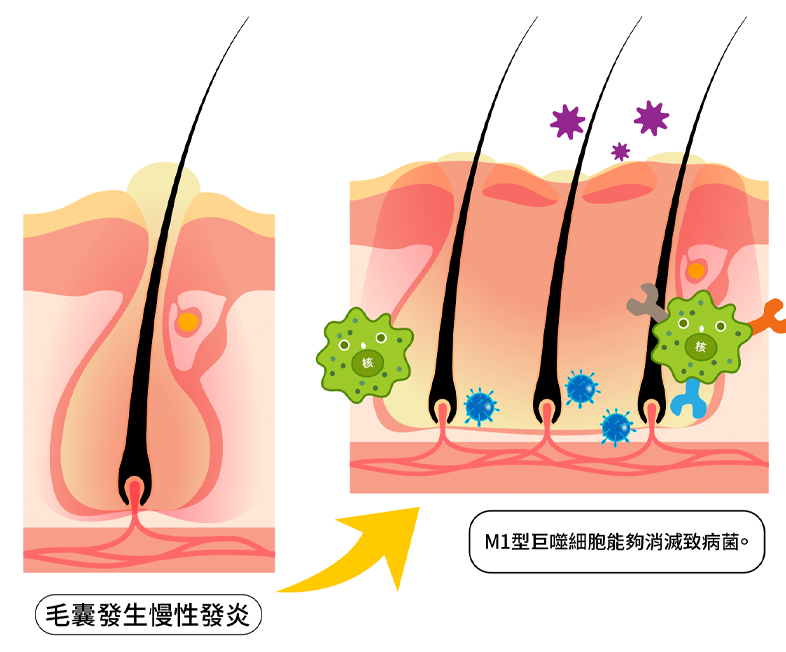 透過活化巨噬細胞,有助找回發炎與抗發炎之間的平衡,減輕慢性發炎對毛囊的破壞,建立健康免疫微環境,強固毛囊根基。