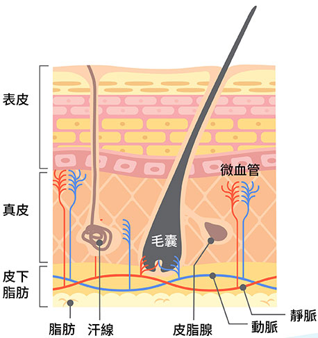 在皮膚中,微血管遍布真皮層(並非表皮),為真皮中的膠原蛋白和彈性蛋白產生、細胞分裂所引致表皮修復再生以及頭髮生長提供必要的營養。對於維持良好皮膚的健康,微血管的數量及品質是當中重要因素。