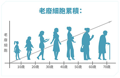 年齡增長、紫外線、飲食不良等因素,都會使先天免疫細胞功能衰退,導致老廢細胞積聚。由於它們不會自行分裂及凋亡,並會持續釋放毒素,導致損害周邊年輕細胞健康,加劇發炎和衰老循環。在內在方面,我們會稱之為免疫失調;而外在方面,就是老化現象,例如出現皺紋、皮膚鬆弛,更嚴重會發炎以至出現濕疹等。