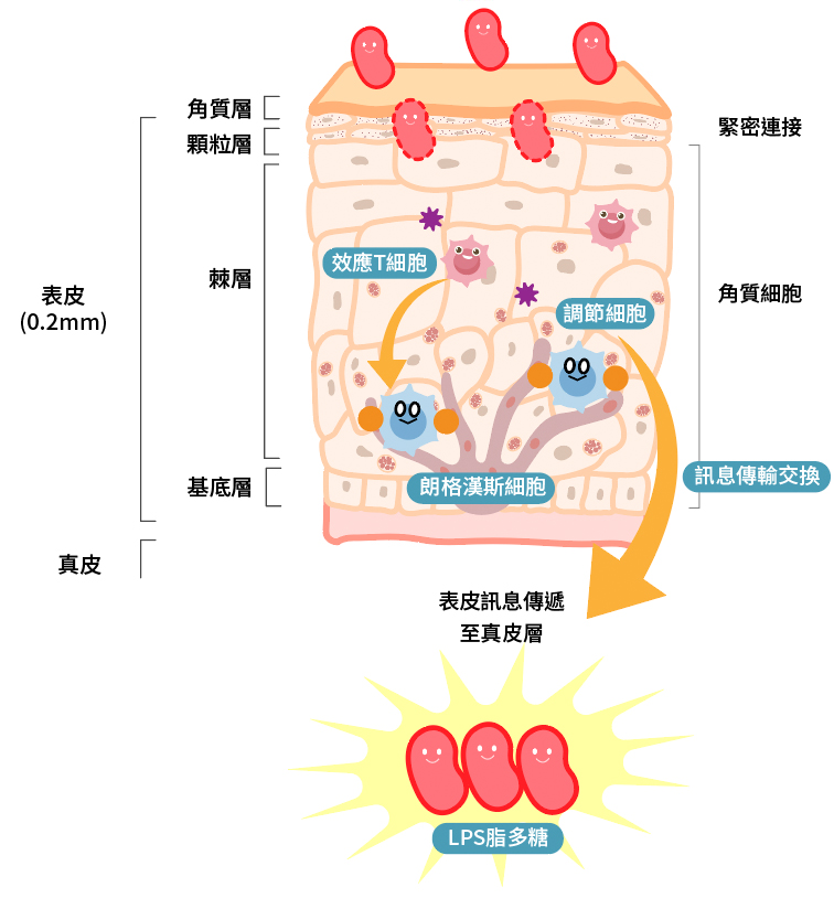 由於LPS脂多醣分子中含皮脂親和力的脂質,所以能滲透進角質層。角質層下方的顆粒層「緊密連接」,能阻止大多數物質通過,包括LPS脂多醣。LPS脂多醣 的受體存在於角質細胞中,最常見是位於表皮的朗格漢斯細胞,其細胞樹突會延伸至角質層;其次是調節T(Treg)細胞,並以抑制的方式控制發炎。由於LPS脂多醣會對這些細胞類型有所反應,即使不能穿透其「緊密連接」結構,LPS脂多醣也能於皮膚免疫系統中發揮效用。